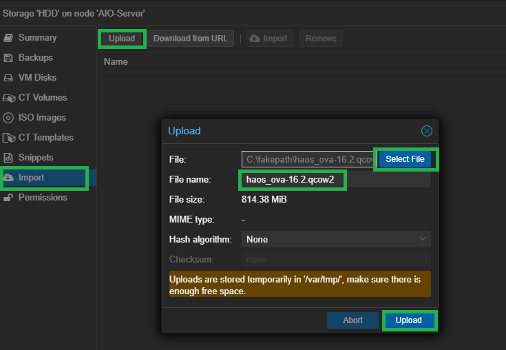 上传.qcow2文件到 Proxmox VE 控制台的本地存储中