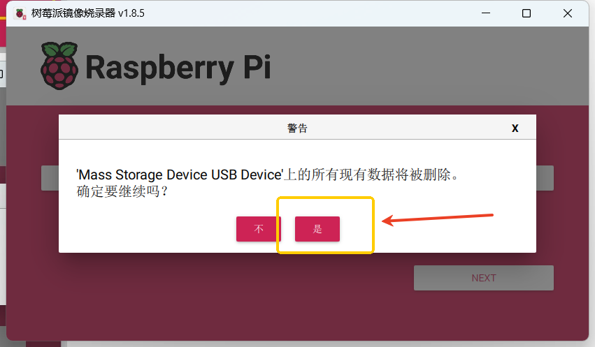 - 点击"NEXT"-> 允许清空SD卡的所有数据