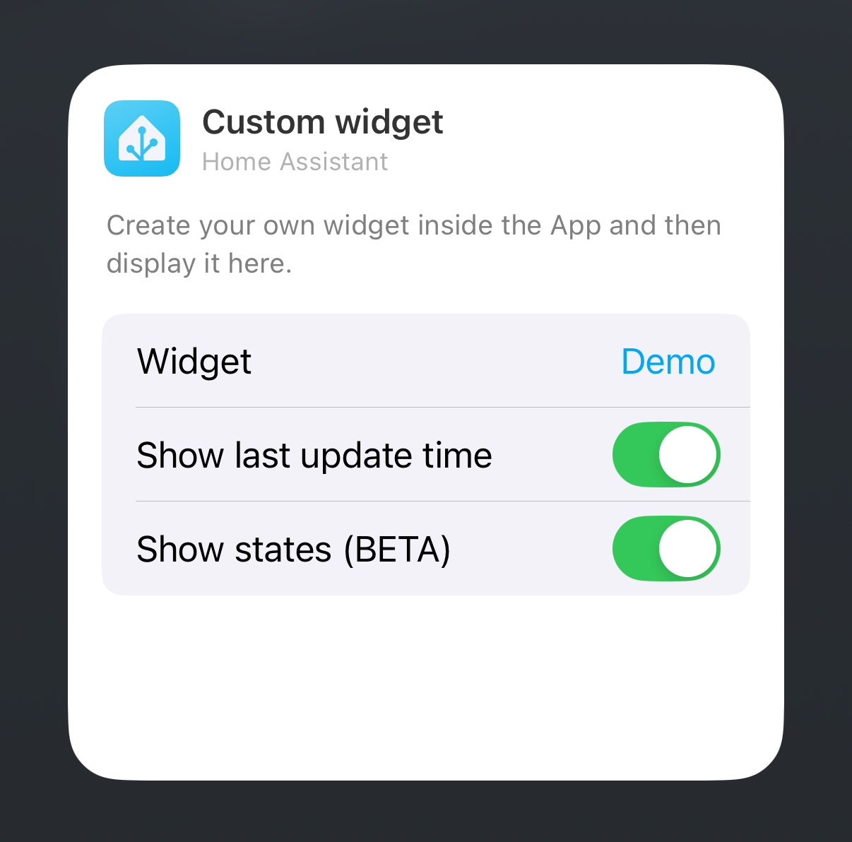 在 iOS 中,我们有小部件可以更新的次数的有限预算,即使当我们请求此更新(在后台)时,也不能保证它会发生,iOS 会考虑用户对应用的使用、屏幕是否开启/关闭、小部件是否可见以及几个其他因素。 要增加刷新次数,您可以发送带有"update_widgets"命令的无声推送通知,您甚至可以创建一个自动化在特定实体状态更改时发送此推送。