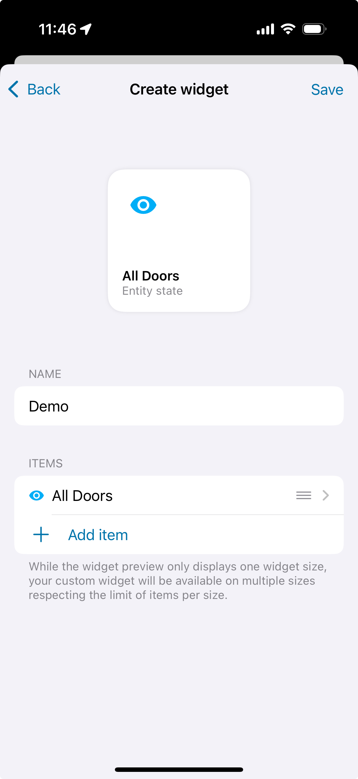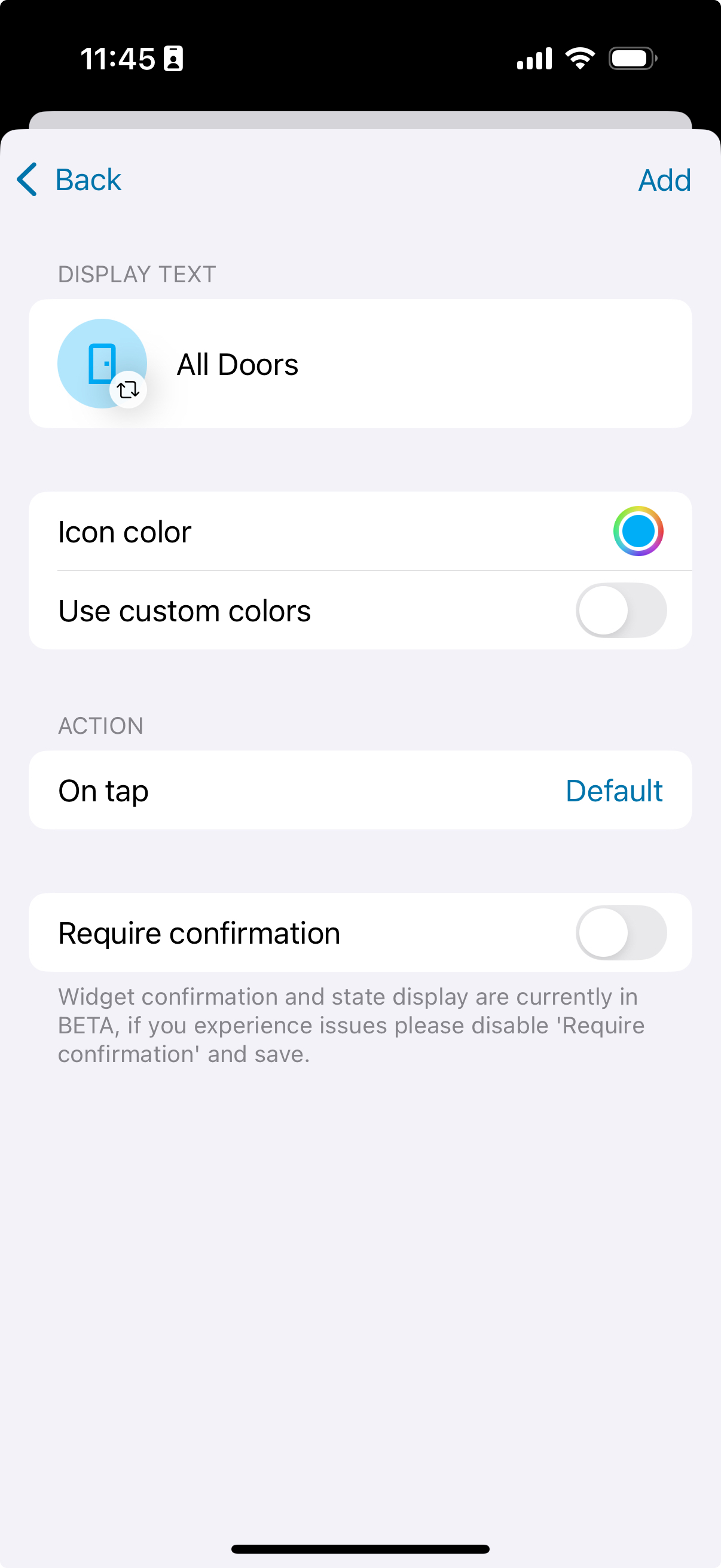最可定制的小部件,您可以在应用内通过 伴侣应用设置 > 小部件 > 创建 创建其配置,决定显示哪些实体、选择它们的图标、图标颜色、显示文本、文本颜色、背景颜色、"点击时"操作以及是否在运行前需要确认。