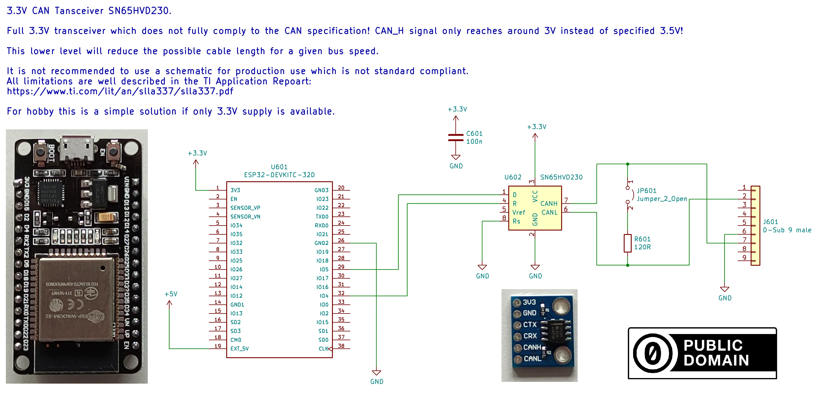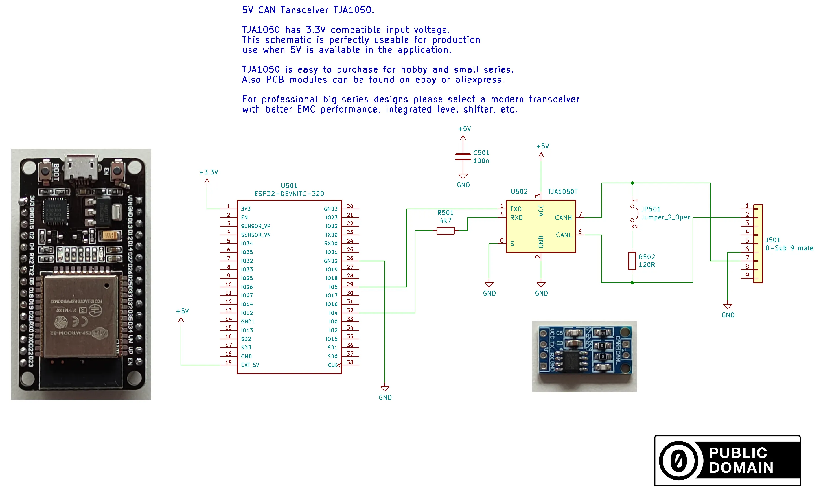5V CAN 收发器便宜且能产生合规的电平。如果您使用 5V 为开发板供电,这是首选方案。R501 很重要,用于将 5V 逻辑电平降低到 3.3V,以避免损坏 ESP32。您也可以在此处使用分压器代替。