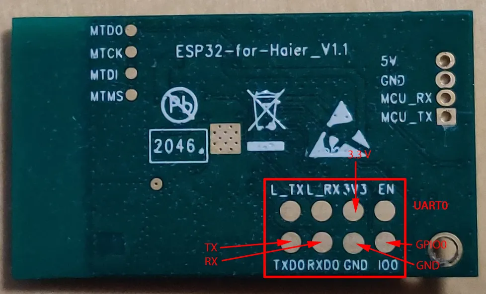 使用名为 ESP32-for-Haier 模块的新款海尔型号。这是一个带有 ESP32-S0WD 芯片的 ESP32 单核板。在某些情况下,您可以重复使用此模块并用 ESPHome 刷写它,但某些新模块不支持此功能。它们外观相同,但启用了加密。