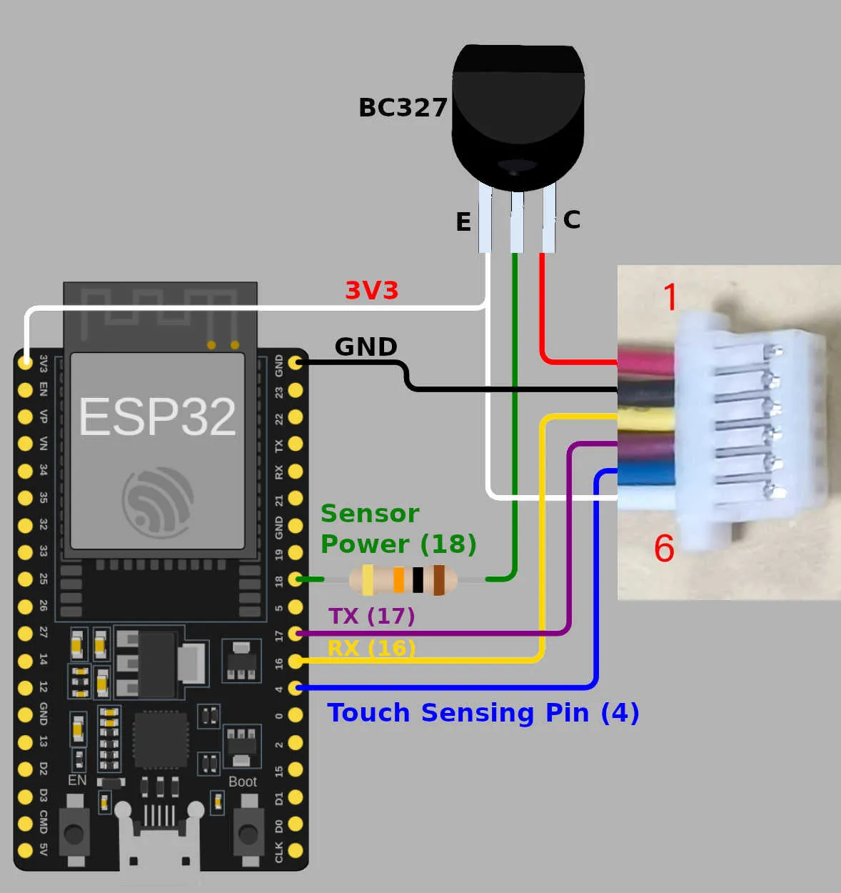 要实现此功能,您需要一个额外的空闲 GPIO 引脚来控制传感器的电源开关,以及两个外部元件:一个 10kOhms 电阻和一个 PNP 晶体管(如 BC327)。