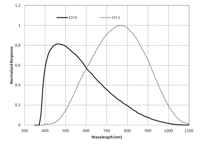 设备由两个光电二极管组成:CH0 二极管对可见光和红外光都敏感,CH1 二极管仅对红外光敏感。