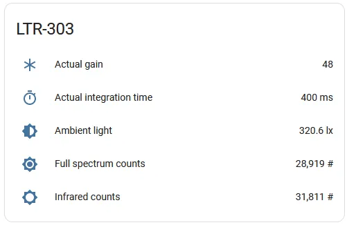 ltr_als_ps 传感器平台允许您在 ESPHome 中使用一系列 LiteOn 环境光和接近传感器。需要在配置中设置 I²C 总线 才能使此传感器工作。
