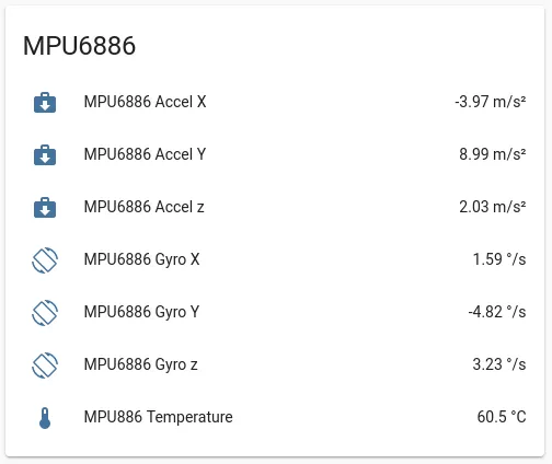 # 示例配置条目sensor: - platform: mpu6886 address: 0x68 accel_x: name: "MPU6886 Accel X" accel_y: name: "MPU6886 Accel Y" accel_z: name: "MPU6886 Accel z" gyro_x: name: "MPU6886 Gyro X" gyro_y: name: "MPU6886 Gyro Y" gyro_z: name: "MPU6886 Gyro z" temperature: name: "MPU6886 Temperature"-