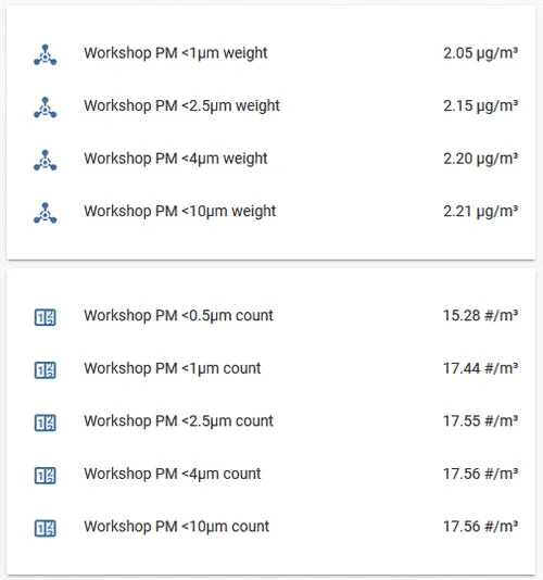 # 示例配置条目sensor: - platform: sps30 pm_1_0: name: "车间 PM <1µm 质量浓度" id: "workshop_PM_1_0" pm_2_5: name: "车间 PM <2.5µm 质量浓度" id: "workshop_PM_2_5" pm_4_0: name: "车间 PM <4µm 质量浓度" id: "workshop_PM_4_0" pm_10_0: name: "车间 PM <10µm 质量浓度" id: "workshop_PM_10_0" pmc_0_5: name: "车间 PM <0.5µm 数量浓度" id: "workshop_PMC_0_5" pmc_1_0: name: "车间 PM <1µm 数量浓度" id: "workshop_PMC_1_0" pmc_2_5: name: "车间 PM <2.5µm 数量浓度" id: "workshop_PMC_2_5" pmc_4_0: name: "车间 PM <4µm 数量浓度" id: "workshop_PMC_4_0" pmc_10_0: name: "车间 PM <10µm 数量浓度" id: "workshop_PMC_10_0" pm_size: name: "典型颗粒粒径" id: "pm_size" address: 0x69 update_interval: 10s idle_interval: 5min-
