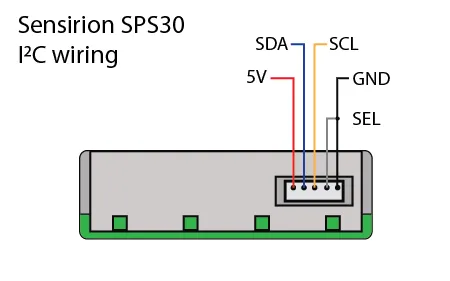 该传感器采用 5 针 JST ZHR 型连接器,间距为 1.5mm。(匹配连接器外壳,数据手册) 要强制传感器进入 I²C 模式,应将 SEL 引脚(接口选择,第 4 脚)短接到地(第 5 脚)。