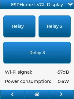 lvgl: ... top_layer: widgets: - buttonmatrix: align: bottom_mid styles: header_footer pad_all: 0 outline_width: 0 id: top_layer items: styles: header_footer rows: - buttons: - id: page_prev text: "\uF053" on_press: then: lvgl.page.previous: - id: page_home text: "\uF015" on_press: then: lvgl.page.show: main_page - id: page_next text: "\uF054" on_press: then: lvgl.page.next:要使此示例正确显示,请使用上面的主题和样式选项以及 LVGL 自己的库字体。