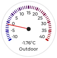 sensor: - platform: ... id: outdoor_temperature on_value: - lvgl.indicator.update: id: temperature_needle value: !lambda return x * 10; - lvgl.label.update: id: temperature_text text: format: "%.1f°C" args: [ 'x' ]lvgl: ... pages: - id: meter_page widgets: - meter: align: CENTER height: 180 width: 180 scales: - range_from: -100 # 指针值的刻度 range_to: 400 angle_range: 240 rotation: 150 indicators: - line: id: temperature_needle width: 2 color: 0xFF0000 r_mod: -4 - tick_style: start_value: -10 end_value: 40 color_start: 0x0000bd color_end: 0xbd0000 width: 1 - range_from: -10 # 值标签的刻度 range_to: 40 angle_range: 240 rotation: 150 ticks: width: 1 count: 51 length: 10 color: 0x000000 major: stride: 5 width: 2 length: 10 color: 0x404040 label_gap: 10 widgets: - label: id: temperature_text text: "-.-°C" align: CENTER y: 45 - label: text: "室外" align: CENTER y: 65下面是相同的传感器配置,但使用带有渐变背景的半圆仪表,由大量刻度线绘制: