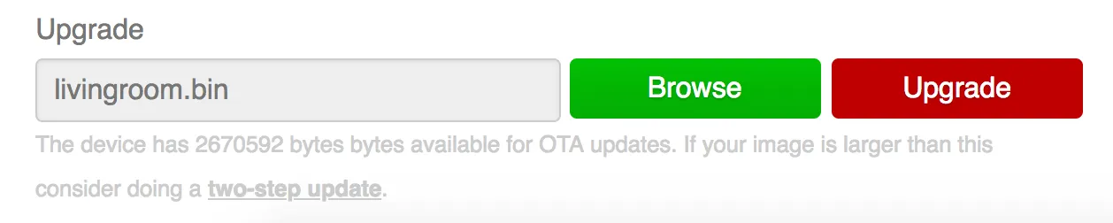 esphome compile livingroom.yaml(当然将livingroom.yaml替换为您的配置文件)并导航到<NODE_NAME>/.pioenvs/<NODE_NAME>/文件夹。在那里您会找到一个firmware.bin文件,这是您要上传的二进制文件。