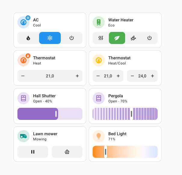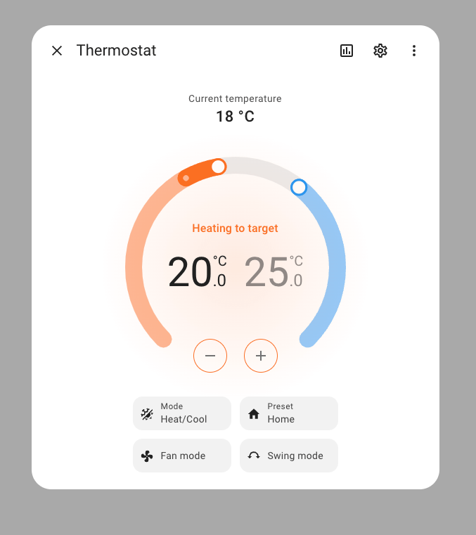 The 实体 dialogs for 温控, 加湿器, and 热水器 实体 got an 更新, and if you ask me, it looks absolutely stunning! It now has a newly designed circular slider showing the current and target temperatures and allows you to easily swipe to the desired target temperature. There are also dedicated buttons to change the target, so it is easy to use if you are not using a touchscreen. It will glow in the middle to show its current 动作, for example when it is heating or cooling.