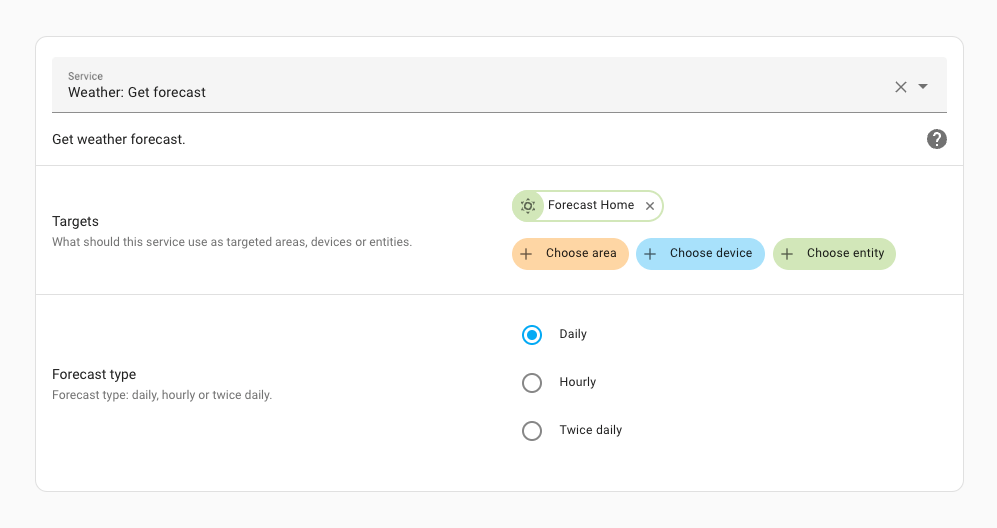 We added a new 服务 for weather 实体, weather.get_forecast, that responds with the weather forecast.