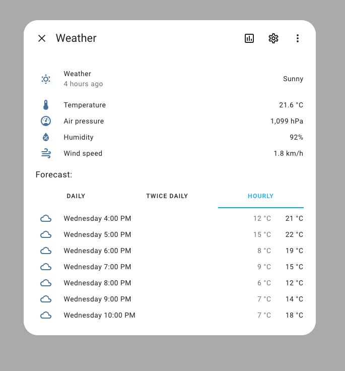 If an 实体 supports multiple forecasts, you can choose which forecast you want to see in the more info dialog. In the weather 卡片 in your 仪表盘, you can also now pick what kind of weather forecast you want to show in that 卡片.
