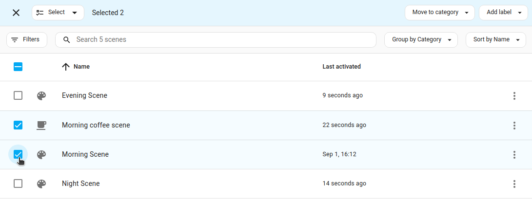 您现在可以对所有选中的元素应用更改,例如应用标签或启用或禁用实体和自动化。