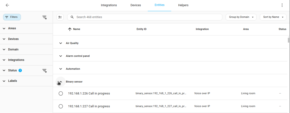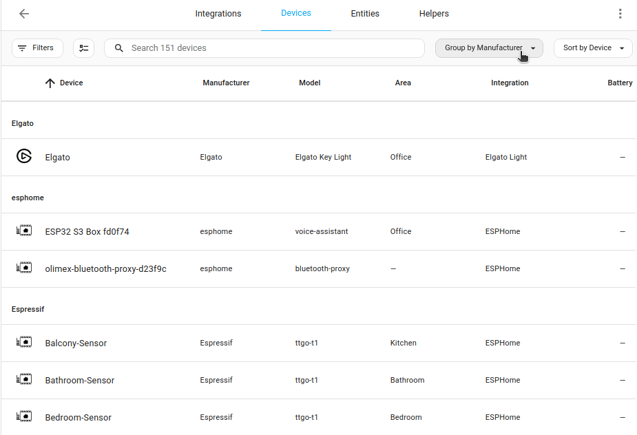 - 相比之下,实体表格不允许按制造商分组,但可以按实体域分组。