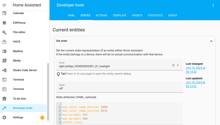 此部分显示所有可用实体、其对应的状态和属性值。状态和属性信息是 Home Assistant 在运行时看到的内容。要使用新状态或新属性值更新实体,请选择该实体,滚动到顶部,修改值,然后选择设置状态按钮。