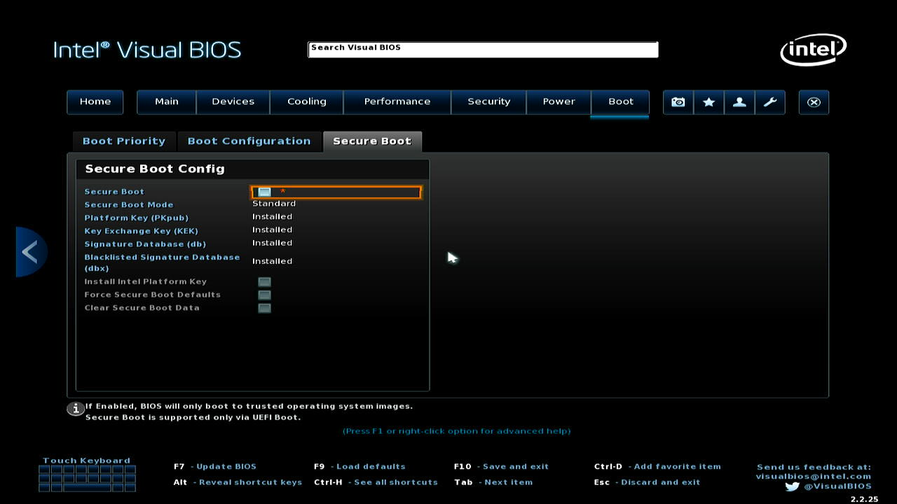 要启动 Home Assistant OS,BIOS 需要启用 UEFI 启动模式并禁用安全启动。以下截图来自第 7 代 Intel NUC 系统。BIOS 菜单在您的系统上可能看起来不同,但选项应该仍然存在且名称相似。