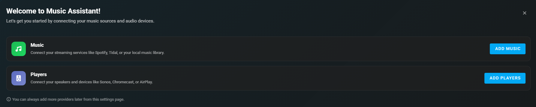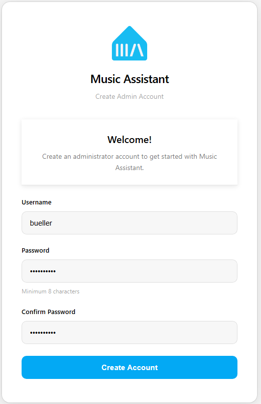 首次启动时,用户看到的内容取决于安装类型和访问方式。如果 Music Assistant 服务器作为应用安装在 Home Assistant 中,并且通过 HA Ingress 访问 MA UI,则管理员账户将在 Music Assistant 中自动设置,用户将直接进入设置页面。在所有其他情况下,用户将看到初始身份验证设置对话框。非常重要的一点是,不要忘记首先设置的管理员用户和密码,因为以后无法获取。如果忘记了这些,则需要重建 MA 服务器(docker 用户可以删除 auth.db)。