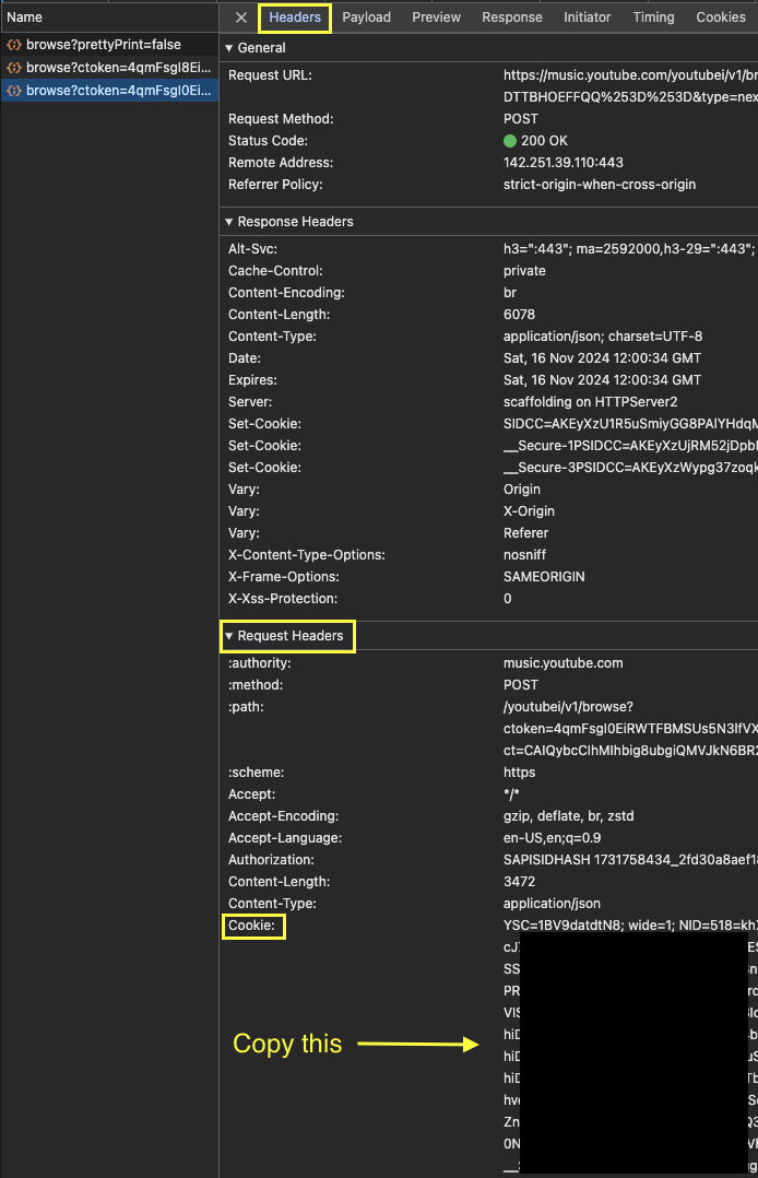 如果保存后看到 __Secure-3PAPISID,这意味着 cookie 不是来自验证请求。导航到 YT Music 中更多需要验证的页面(例如您的媒体库)。要确认已获取正确的 cookie,请将其粘贴到文本编辑器中并搜索"__Secure-3PAPISID"。如果在获取具有此值的 cookie 时遇到困难,请尝试不同的浏览器。
