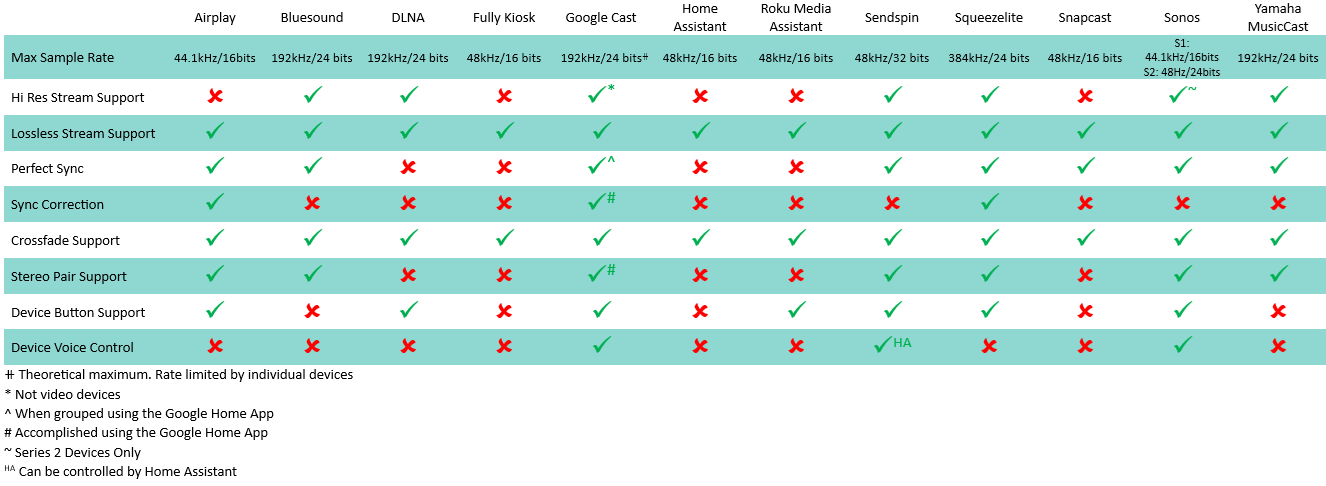 有关特定播放器提供者的信息,请参阅本文档中的相关部分。有关可能设置的描述,请参阅播放器提供者设置单个播放器设置页面。当启用播放器提供者时,支持该协议的设备将被 Music Assistant 自动发现。下表总结了播放器功能。请注意,DLNA 和 HA 播放器可能由于所需标准的实现不佳而受到影响。如果这些播放器类型不能很好地工作,并且设备支持其他协议,请使用其他协议。