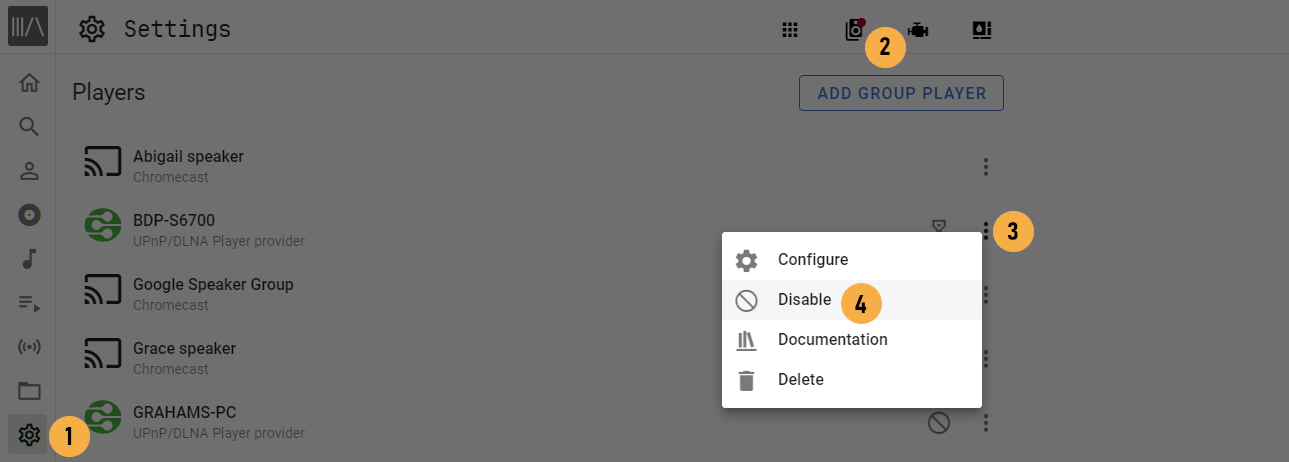 播放器只有在不可用或禁用时才能删除。如果播放器有问题,删除播放器可能很有用。变得或仍然可用的已删除播放器将重新被发现,并在 MA 重启或播放器提供者重新加载时返回列表。