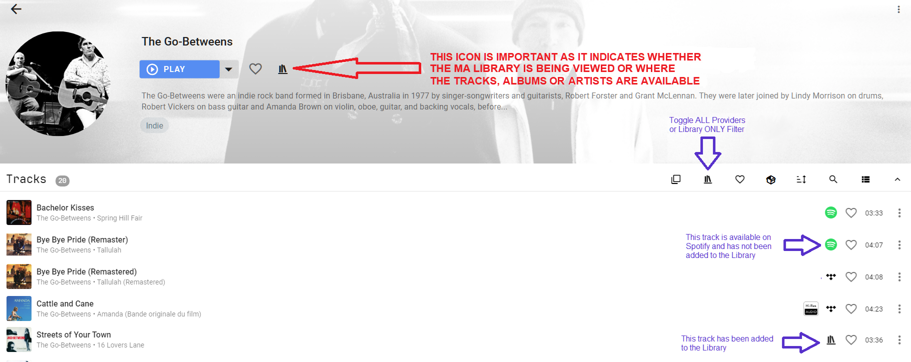 对于流媒体提供商,只有流媒体提供商库中(或收藏夹,或提供商中任何称呼方式)的特定艺术家/专辑/音轨/播放列表才会在添加提供商时和每次同步时导入*到 MA 库中。这意味着,例如,如果您在提供商库中有一位艺术家但没有他们的任何专辑,那么您在 MA 库中只会看到该艺术家,而没有关联的专辑或音轨。如果您想在库视图中看到它们,您必须随后将专辑或音轨添加到 MA 库中。请注意,您可以切换库/流媒体提供商筛选选项以查看流媒体提供商中所有可用的内容。