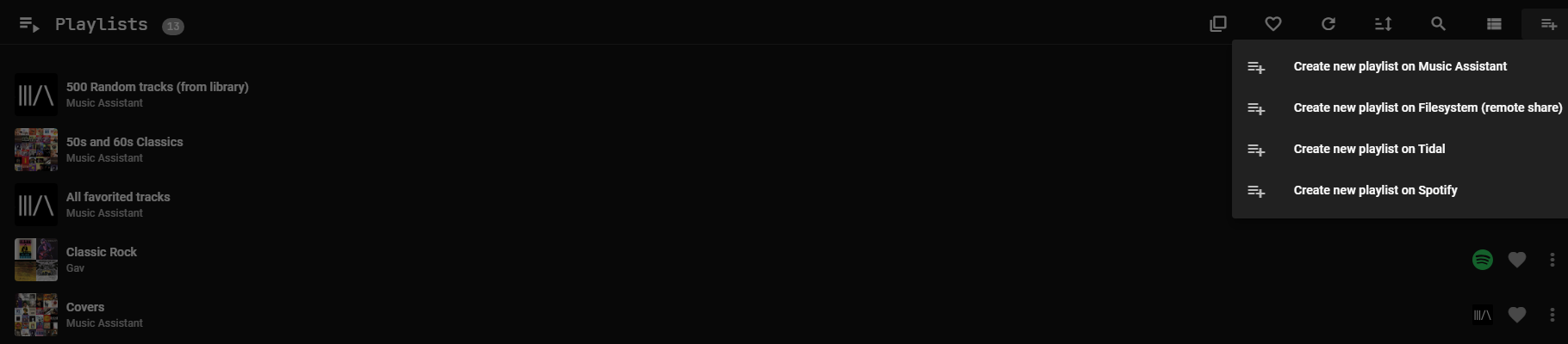 播放列表必须存储在提供商上。音乐提供商的播放列表只能包含来自该提供商的音轨。但是,MA 有一个内置提供商,能够创建包含来自多个音乐提供商音轨的播放列表。在这种情况下,播放列表将仅存储在 MA 数据库中。这些选项会自动显示在"添加到播放列表"对话框中。