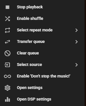 右上角可用菜单中的选项如下所示。重复和随机播放在播放器栏底部(或窄移动设备的"正在播放"视图中)也有按钮。